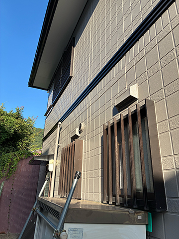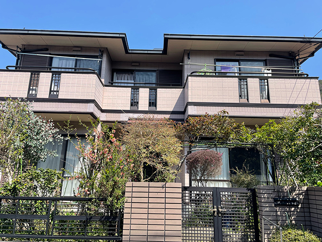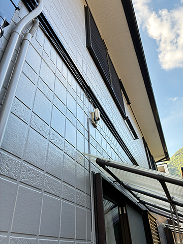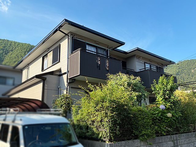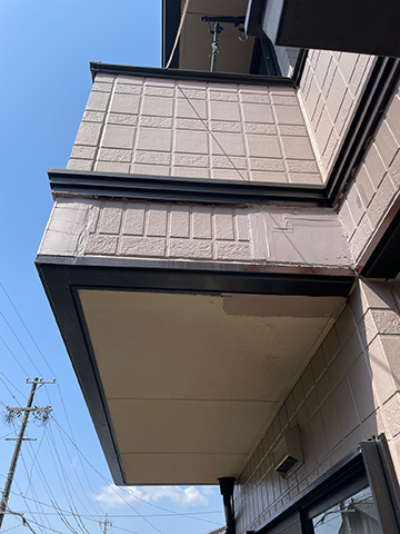 まずは現場調査をさせていただくと、外壁に熱による膨張や塗膜の浮きが確認できました。今後の事を考慮し、建物の表面温度を下げる効果がある遮熱塗料で施工をご提案させていただきました。ベランダは既設の外壁が剥がれたり反っていましたので、ベランダには塗装せず板金を被せる形で補修をしました。