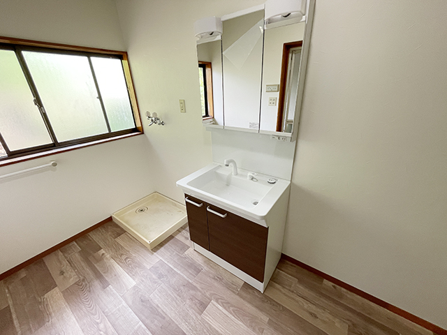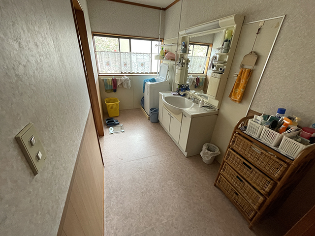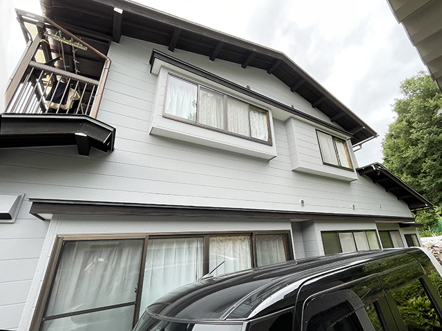 外壁はサイディング部分をナノコンポジットにてツートンカラーに塗り分けしました。木部は既存色にて塗装をしています。洗面台・トイレの入替に合わせて脱衣室やトイレの内装(床クッションフロアとクロス)の張替もご提案させていただきました。和室内は木部を塗装し、表具・畳を一新しています。