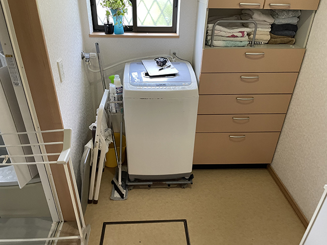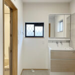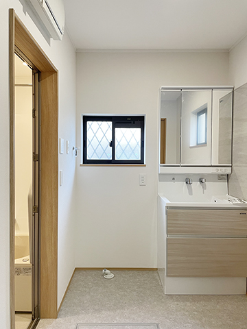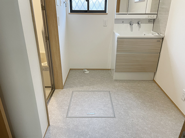 洗面脱衣所は洗面化粧台と収納棚の配置を変え、化粧台と洗濯機が横になるように配置しました。洗面化粧台はタカラのファミーユです。お風呂はタカラのグランスパを採用し、ゆったりとくつろいで入浴できる空間となりました。