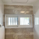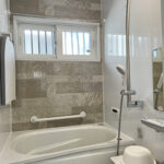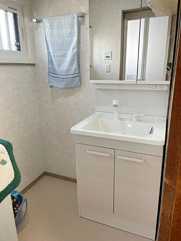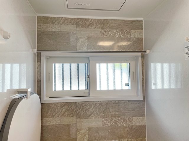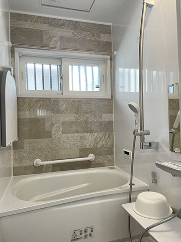 タイルの在来風呂をユニットバスに改修し、浴室暖房をつけることで暖かい空間にする提案を行いました。浴室と洗面所の窓も交換させていただき、断熱性を向上しています。洗面所には換気扇を新しくつけることで湿気対策も行いました。TOTOのサザナを設置しています。