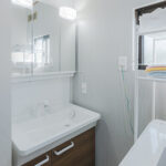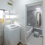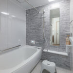 既存のお風呂は少し小さめのサイズでしたので、脱衣場のスペースを調整して一回り大きいサイズでの提案をさせていただきました。お風呂と脱衣室はグレーを基調に、縦流れのクロスをアクセントとして使い落ち着いた空間に仕上げています。