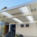 ポリカーボネート屋根のカーポートではなく、強度が強いスチール折板屋根の製品をご提案しました。設置したのはYKK のジーポートです。カーポート周りの植栽の撤去も同時に行い、道路に面したエクステリアをスッキリさせました。